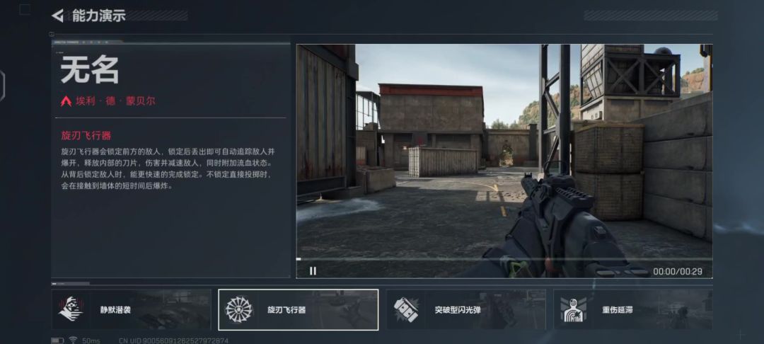 长按会手持飞行器,可以锁定前方敌人在锁定时会有一个圆形的锁定动画当这个圆圈整体变红就说明已经完成了锁定,敌人如果背对你的话会加速锁定时间当锁定敌人后飞行器会自动追踪敌人并造成高额伤害,还会给敌人带上减速和伤害流血效果,也可短按直接释放,当释放时前方有墙体在前面会进行一次反弹,第一次弹射之后两秒内爆炸并释放大量的飞刃,会对敌人造成3秒的残疾不过需要注意规避队友,触碰到队友也会使得飞行器提前爆炸,同时也会对队友造成伤害如果飞行器如果距离自己过近,爆炸也会对自身产生一定的伤害,以及流血的效果。