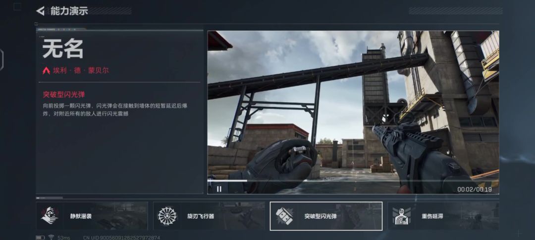 2技能为一颗投掷型的黑色闪光弹,长按后可以进行瞄准短则直接投掷,不用像乌鲁鲁那样需要拉栓即点即用,当闪光弹触碰到墙体后的0.7秒左右会触发闪光弹效果,且带有命中提示,被命中后屏幕会进入全黑状态,并且带有震撼弹效果,听觉也会受到干扰。