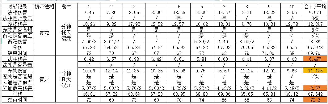 如图所示二十把切磋全部胜利,可以发现的是使用两雷的组别,不论是青龙实相的伤害,还是宠物的伤害,以及战斗时长 均优于百族。而且十场里法相暴击三次,且衔阳伤害较高,两雷的玩法 强度不比百族低,爆发确实有较大提高。有个很奇怪的现象,换成百族后的法相伤害比两雷低两亿,应该是法体效果的原因吧。