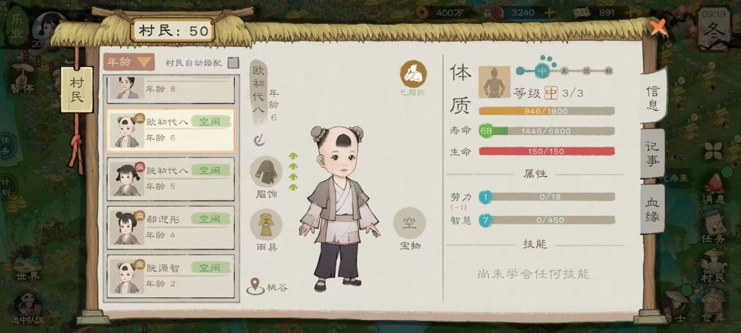 3.不死树使用技巧:熟练运用不死树查缺补漏,优先把寿命低的刁民放上去,让其摘果,可以获取大量寿命经验,不死树我目前总结的规律是:(不保真),寿命低的会获得更多果子,如果寿命相同,则寿命经验少的会获得更多果子,可以将最需要果子的放在一号位