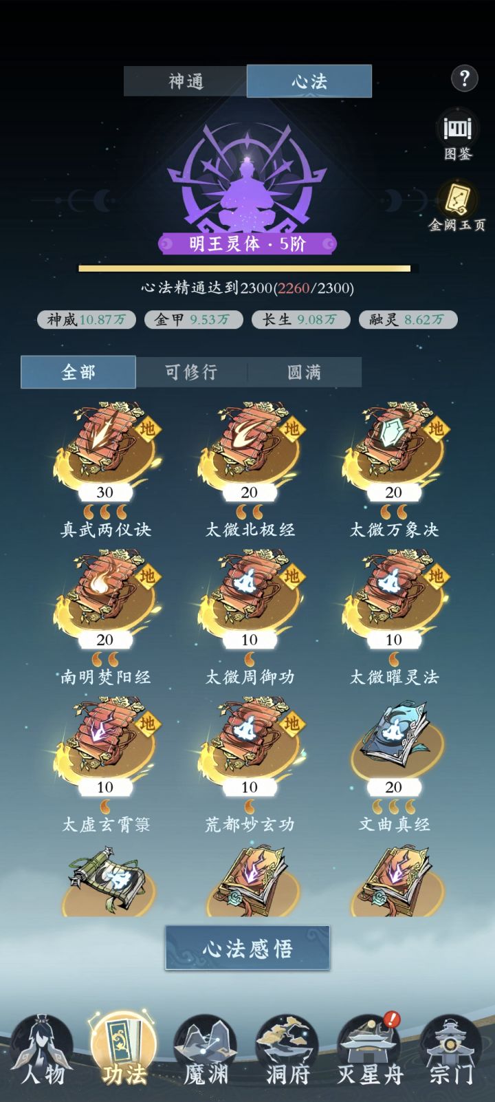 一、心法有神威、金甲、长生、融灵四大方面,其中神威最重要,其次是长生。
