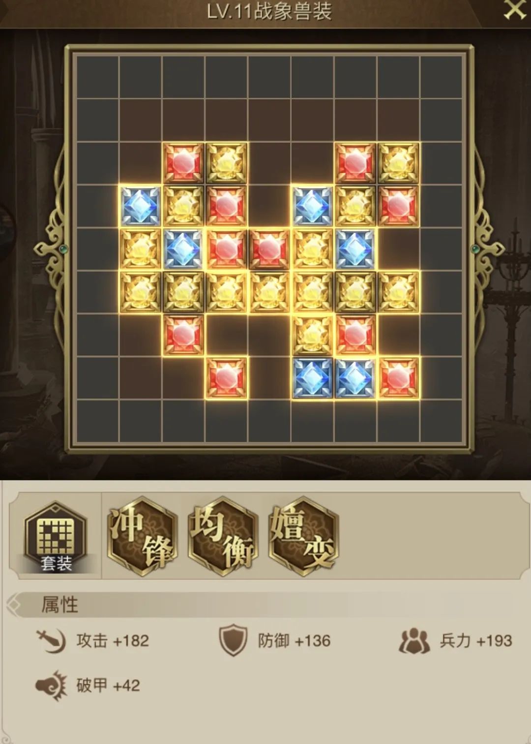 10阶兽装【冲锋+均衡】一共有2个组合,蓝色组合攻击属性多12,红色组合兵力属性多16。