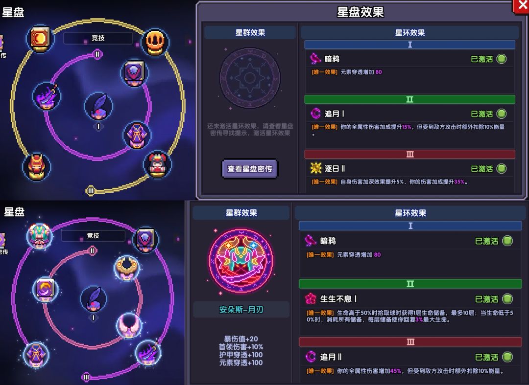 (ps.主要就两种带法,三日二月的散搭和月刃星群。双穿缺口较大时推荐携带月刃。)