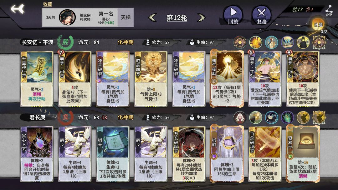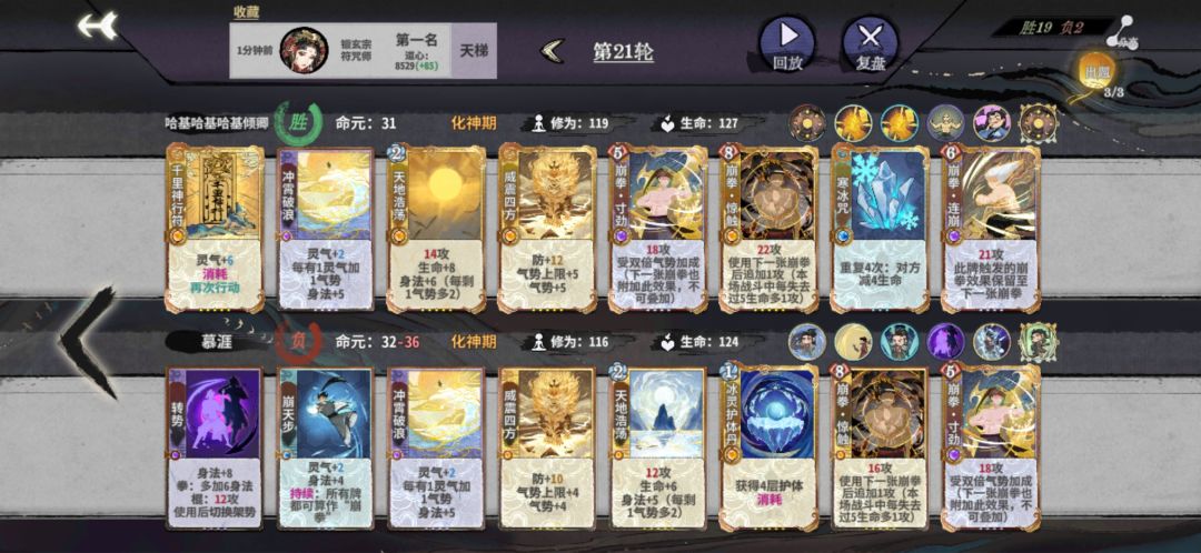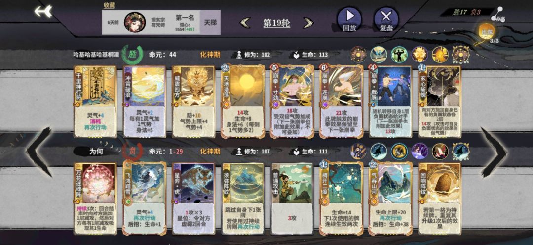 ①化神初期:考虑到符崩化神d牌,快速成型的可能性不大,气势这方面可以用迷踪步或者气若悬河给灵气然后冲霄或者踏霄提供气势,身法这部分可以上一张闪击?(不要怕输,输是正常的,毕竟没成型)