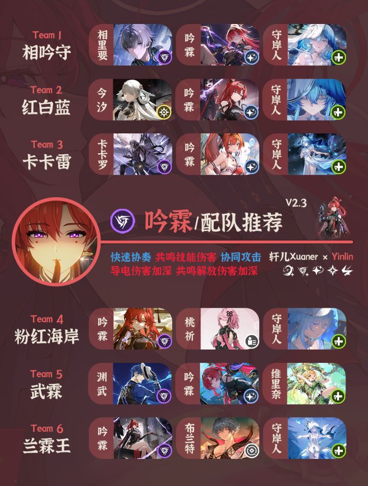 鸣潮吟霖2.3版本该如何配队?轩儿Xuaner为大家整理了六支当前版本理想配队,供各位漂泊者们参考~