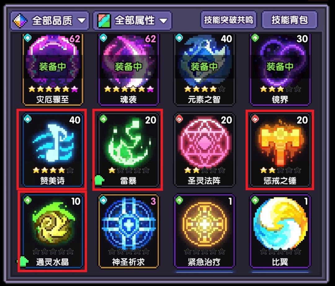 2、当符文模块开启后(小秘境51层后),我们就可以由无流派转向克罗BD来去玩了,武器换上克罗武器,技能的话换上对应克罗魔女的两个必要技能:神圣祈求、潮汐之灵,然后其他两个技能搭配赞美诗+圣灵弹即可。(图2红框)