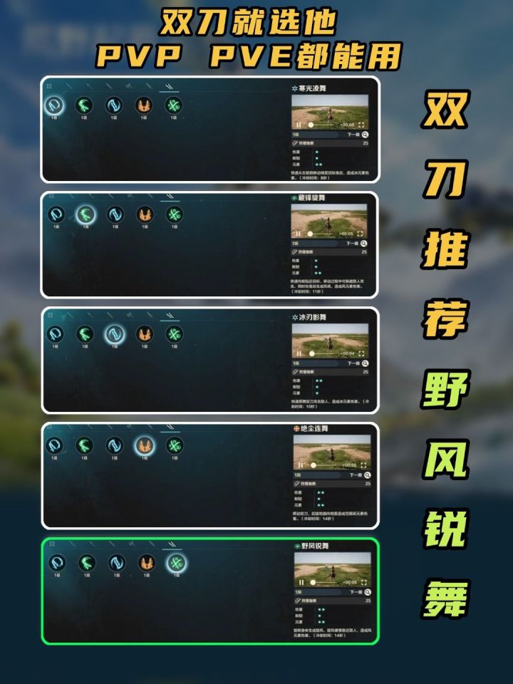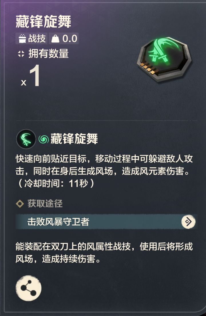 双刀的战技可选非常多,但这边还是推荐野风锐舞。搭配双刀的高攻速输出非常爆炸,在攻略boss中可以短时间打出巨额伤害,PVP中甚至能做到瞬秒对手。不知道双刀用什么战技的拓荒者可以试试哦。这边给大伙附上藏锋旋舞战技的获取方式!