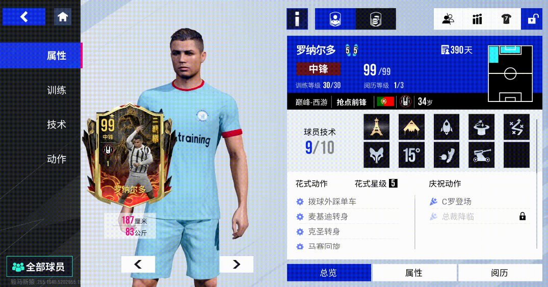 作为最强中锋代表之一,99巅峰罗纳尔多还有着103速度、99加速、103控球和99带球,让他能依靠出色的模型扛住后卫向前推进,最终完成致命一击。此外,【精密带球】【魔术师】银技术和专属花式【总裁变向】,给予玩家更多“游龙”操作空间,在关键时刻挺身而出,打入制胜进球!