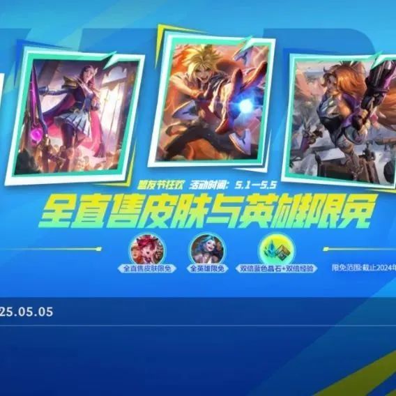 截止至5月5日23:59,356个商城直售皮肤首次限免,全英雄限免、双倍蓝色晶石+双倍经验同步开启!此外,召唤师进行1场对局还可领取龙魂水晶*100好礼~