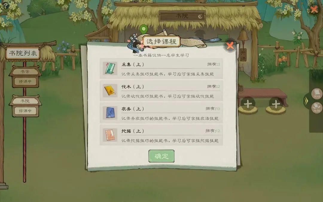 3、技能书使用方法:需建造书舍或者书院,书舍或者书院中选择技能书,书桌处选择要学习的村民,然后直接开课即可(老师缩短学习时间,一本书只能一个村民使用)