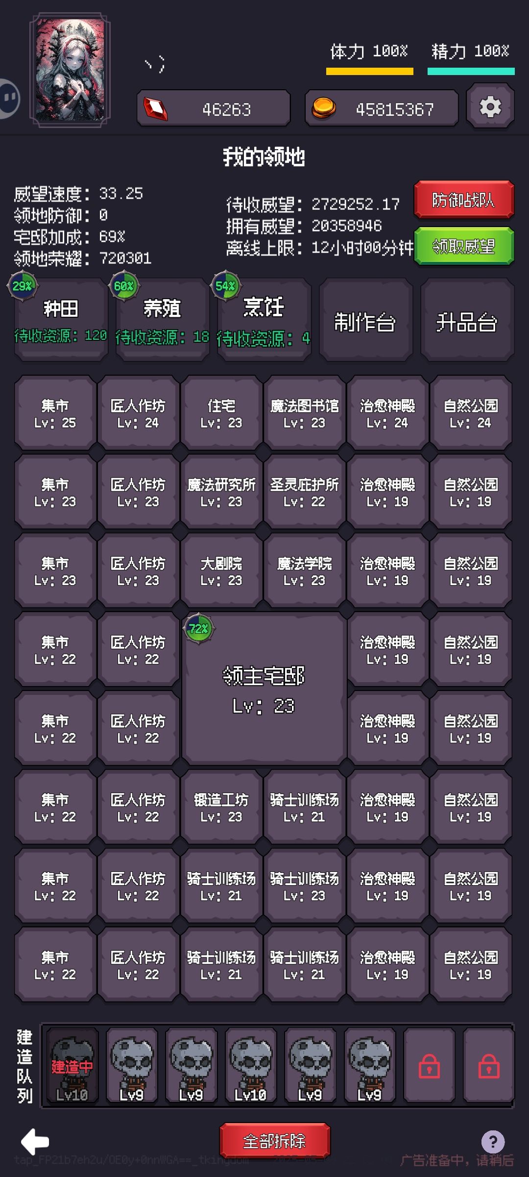 领地建筑最合理的建造查过其他大佬攻略的应该都知道了,就是集市8个,匠人工坊8个,治愈神殿8个,自然公园,骑士训练营5个,其他建筑每种一个。至于怎么摆放,那就随意了。