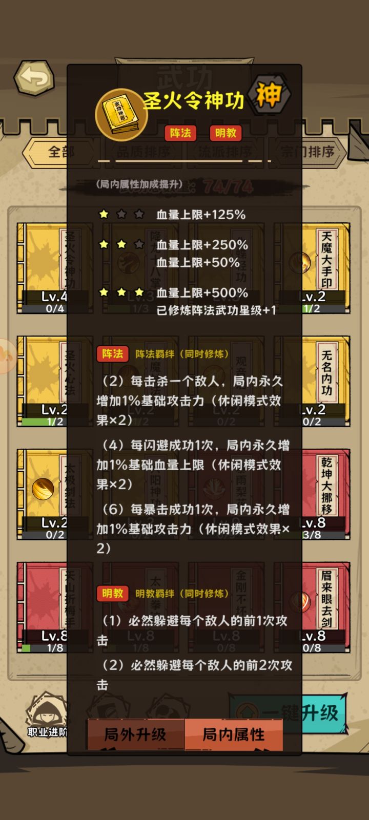 接下来讲具体操作,首先把所有阵法、内功升到2星,然后升级圣火阵法3星。圣火3星特效为所有阵法星级加一,这样所有阵法都3星。阵法3星带动所有流派(内功、气功、刀剑等)都会提升1星,之前说了内功提前升2星,内功升至3星,其他流派2星。而各派内功的特效就是提升本门武功1星。