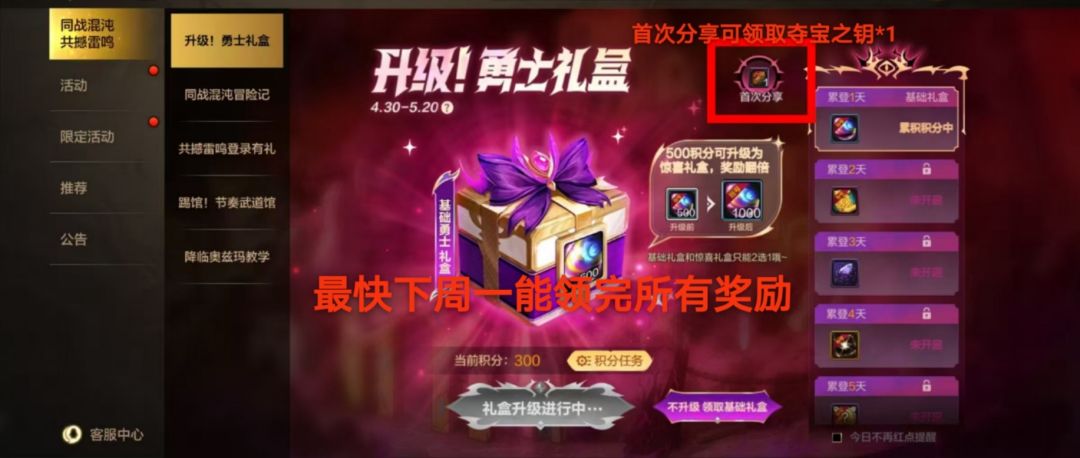 大家通过完成任务日任务、周任务获得积分来升级勇士礼盒,记住一定升级后再领取礼盒,否则奖励少一半!每天都做任务的话最快下周一就能领完所有奖励。