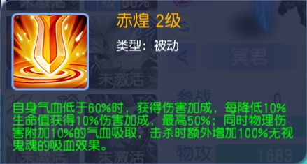 1.附加伤害加成。初始为10%的伤害加成,之后每降低10%获得10%的伤害加成,最高50%。也就是说,自身气血余10%时获得50%的最大伤害加成;