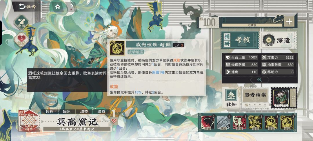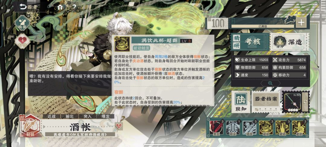 1.酒帐:大招职业穿人后二格上宿醉,宿醉持续一回合,六致知二轮后每回合二动