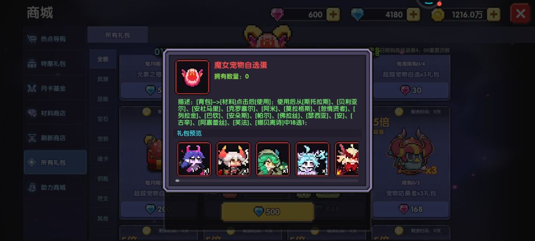 5、前期我还是推荐用一些钻石去买一些宠物蛋的,但只推荐每月限购的超越宠物自选礼包(200钻石)、每月限购的魔女宠物自选礼包(500钻石)和每周限购的传说宠物蛋(120钻石),大家自己看着自身钻石按需来买吧。(图5)