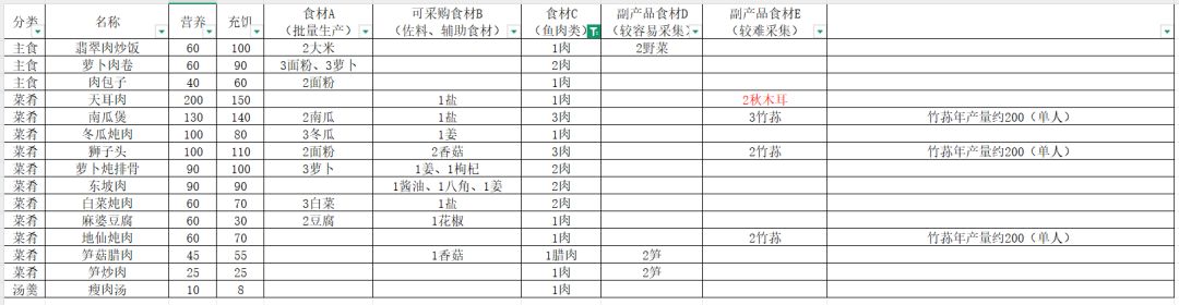 先简单解释下这张表,我把食材分成了5类,A是可量产类,B是可采购食材,C是杂鱼,肉类,D是副产品食材,E是较难获取食材,这是为了后面比较各类食物的性价比。而最右侧那一列,是对E类食材获取的注释,其中青鱼和鲫鱼产量固定,基本就是270和100,而竹荪取决于你有多少竹子,比如我现在15棵,有点无法满足3个人不间断采集,那我一年的竹荪产量大概只有550-570,这个根据个人情况的不同,你们大概估计一下就行。至于这个鸡我为什么不写呢,因为没啥好写的,优先做凤凰游,剩下的做蘑菇鸡汤就行了,糯米鸡因为要用到糯米,所以不太推荐。