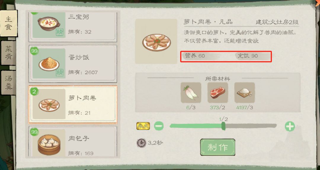 所以,你可以理解为游戏左上角的数值(我称之为饱食度)=食物中的“充饥属性”,那当你实现饱食度自由后,对于食物的选取只需要关注“营养“属性就行了。