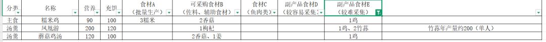 通过上面的解释,我们不难看出,评价一种食物的好坏,单单看其提供的”营养“和合成所需材料就行了,而制约我们获取高级食物的,其实是高级食材。