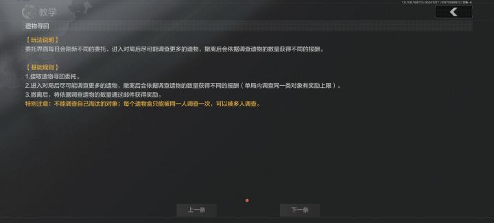 - 寻找遗物:进入战局后,使用配发的信号追踪器追踪信号方向找遗物箱。调查遗物后,根据遗物原本主人的身份获得不同的调查记录,携带调查记录撤离可结算获得柯恩币奖励。每种记录转换次数有上限,非遗物寻回专员获得的调查记录无法转换为柯恩币。