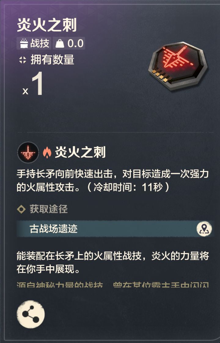长矛作为目前版本最均衡的武器,搭配盾牌可以说是万金油组合,在任何情况下都有着较为完美的发挥,但万金油也就代表着长矛的输出能力不如其他几个输出更高的武器。所以我们需要将长矛盾牌的功能性发挥到极限,战技装备炎火之刺。在挑战boss等怪物时可以快速打出boss处决。如果是组队的话帮队友快速控制boss,自己一个人的话也可以靠处决输出更快速结束战斗!这边也是给大伙附上炎火之刺的方式,不过这个战技的获取是很前期的任务,大伙应该都已经拿到了~