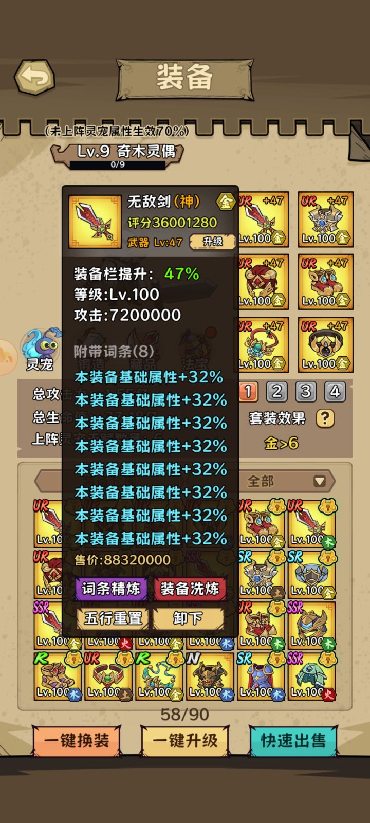 本游戏装备分10-20-……100级,根据推进章节解锁下一级装备。有条件的买四个药(推图失败会弹出),及时更新下一级装备。装备可以设定4套,1战力2挂机3闯关4高品质。(看词条)不断更新这四套装备。资源全部保留