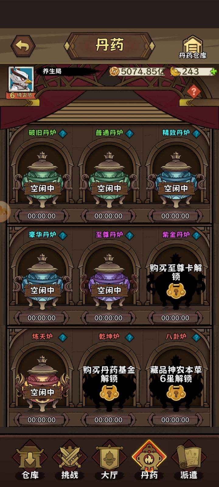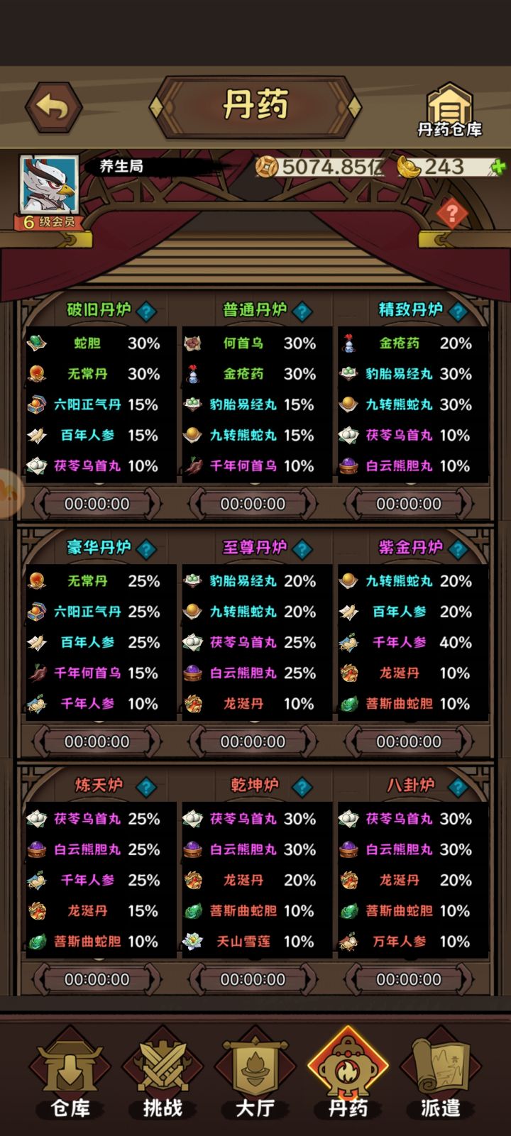 加入宗门后下边会出现丹药以及派遣选项,丹药是炼丹(右上角仓库显示所有丹药),派遣获取炼丹材料