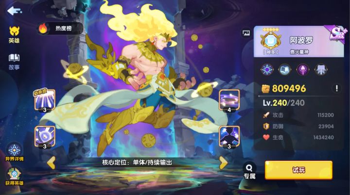 游戏中的角色各有强度特色,阿波罗:开局睡觉的“逆袭战神”:自带开场6秒“躺平”设定,护盾抗压叠星体层数,觉醒后大招毁天灭地,专武30级直接化身BOSS杀手!