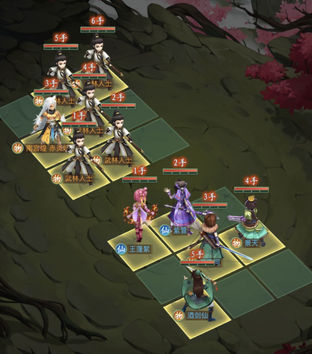 紫萱放2号位,紫萱绝技“雨恨云愁”对敌方每列最后单体造成伤害并有25%概率对目标附加“定”状态,自身死亡时,触发被动“舍己为人”给己方全体伙伴回复最大精力的15%,主要表现以切后排压低对面武林人士精力为主,便于云天河收割以及景天触发追击。