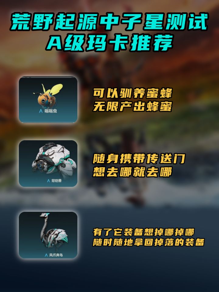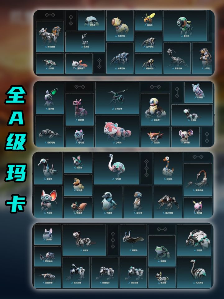 爆肝的小曲响起,来看看有哪些非常好用的A级玛卡。首先推荐嗡嗡虫,可以驯养蜜蜂无限产出蜂蜜。接着是背铠兽,随身携带传送门,想去哪就去哪。风爪奔鸟,有了它装备想掉哪掉哪,随时随地拿回掉落的装备。接着给大伙附上A级玛卡全图鉴,一起看看你还差哪些玛卡没收集吧!