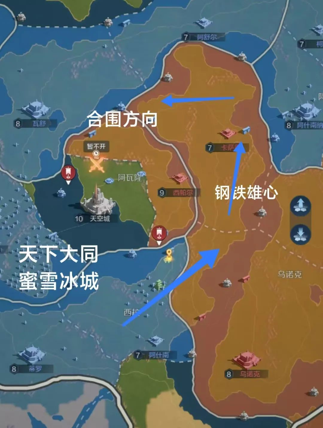 钢铁雄心的凶猛攻势在临近天空城后被陆续赶来的天下大同、蜜雪冰城双方成员所抵挡,正面攻势被彻底粉碎,天下大同一路占地+俘虏,目前天下大同即将完成对天空城的包围!