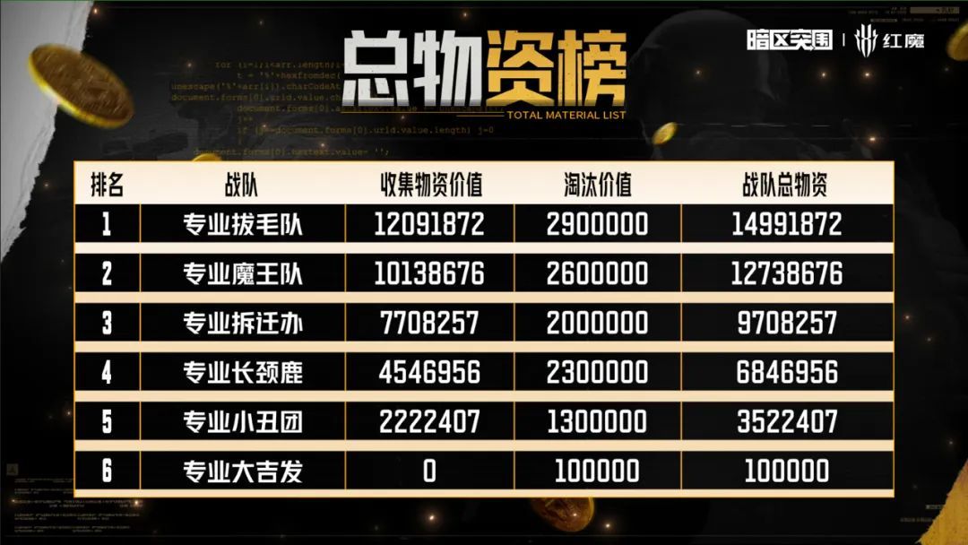 历经三天的专业比拼,专业拔毛队势如破竹!凭借卓越的战术策略和默契的团队配合,最终以14991872的战队总物资,获得最终获得大金杯专业对决的第一名!