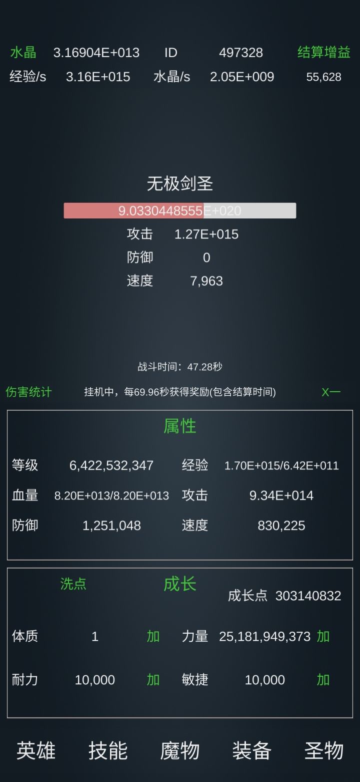 后续圣物把能低级和高级都挂一下,可以把能满级的全部满级(除了沙虫),你觉得有作用的都可以挂一下,超级哪里霸者之道要挂满级,下面那些至少挂到1万级左右,除了泣血石(太久了)。然后就一直挂魔气本源。