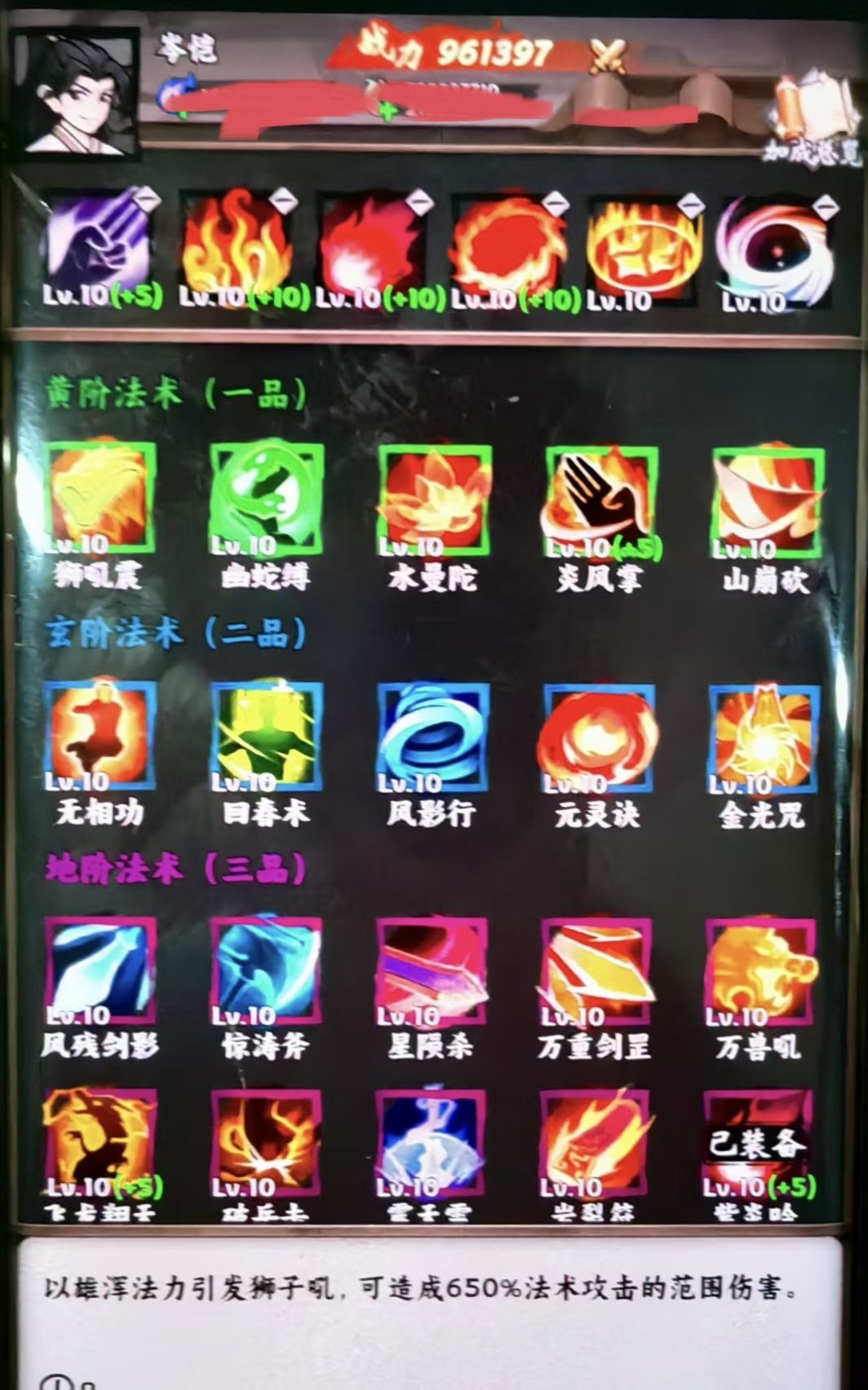 法术∶五灵诀,皇极印,焚天祭火,寂灭指,火炎莲,紫炎鸣(还有一个神技∶破岳击)