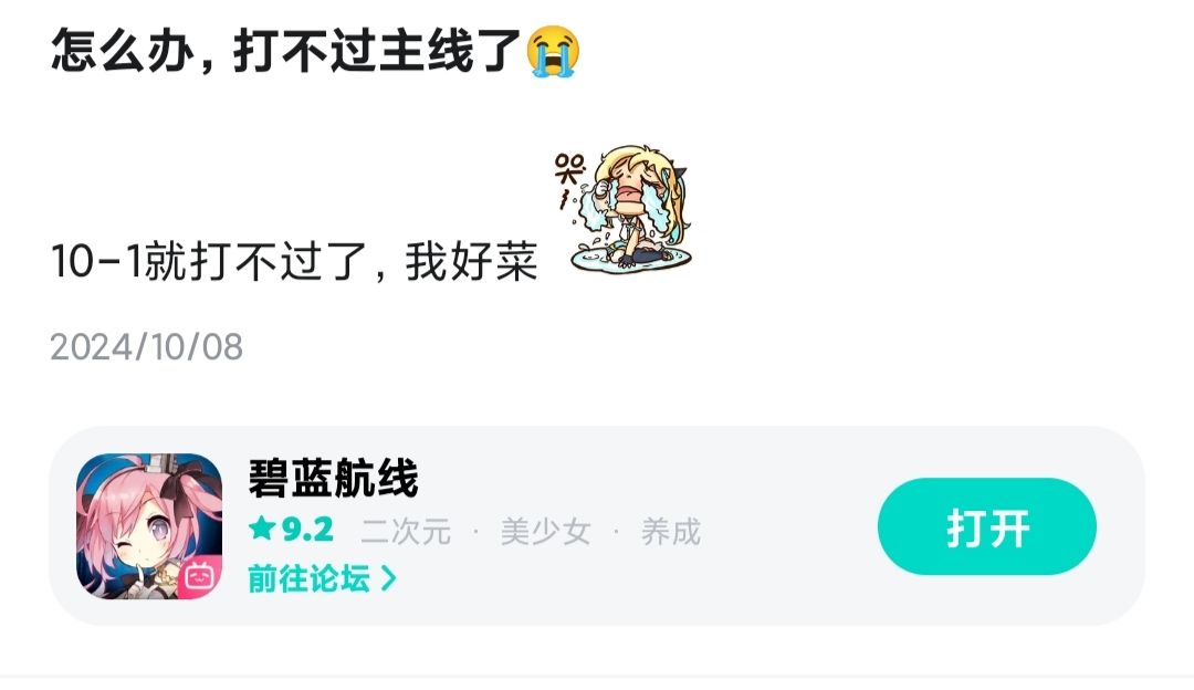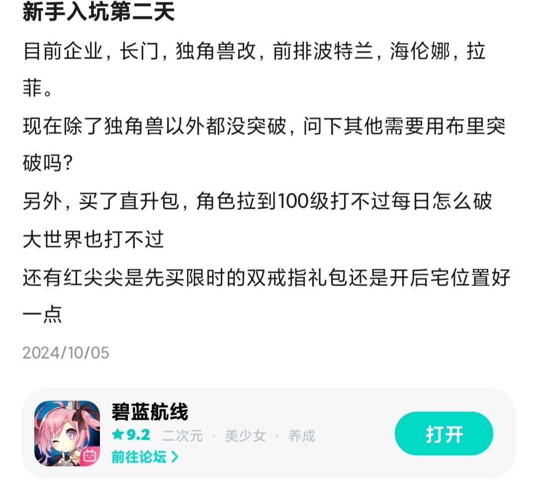 补充2:补充一些说没有强度要求的论坛却全是能产生强度焦虑的直视图,再次建议优化入坑体验,既然没有强度要求那应该可以加强新手角色,强度不要求不会影响卖船