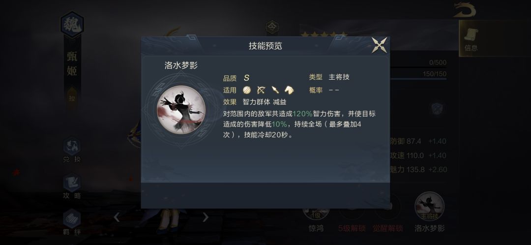 主将技能:洛水梦影(百分之十减伤,叠满百分之四十全伤害减免,非常优秀,而且最重要的是持续全场!!)