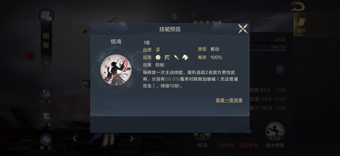 主战法:惊鸿(看介绍就很厉害了,只要释放主动战法,就可以对两目标进行缴械。看的我都流口水,前期守军普攻可是占据了全部输出的大半壁江山啊,甄姬妹妹这样封,真的是太不给守军面子了。)