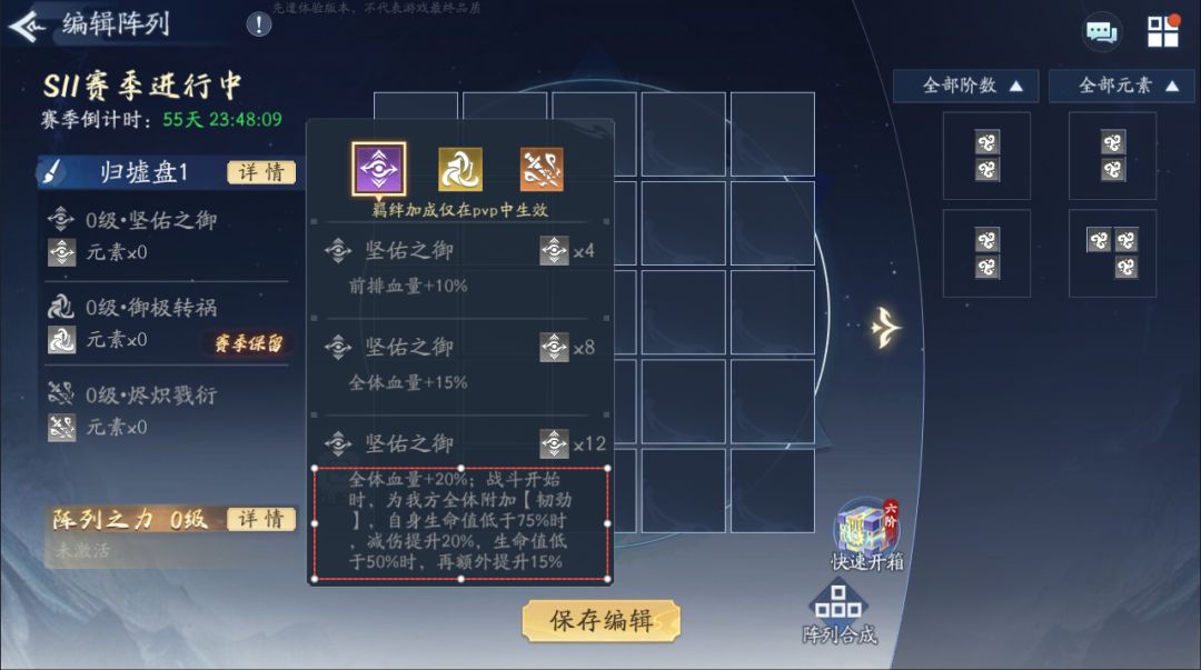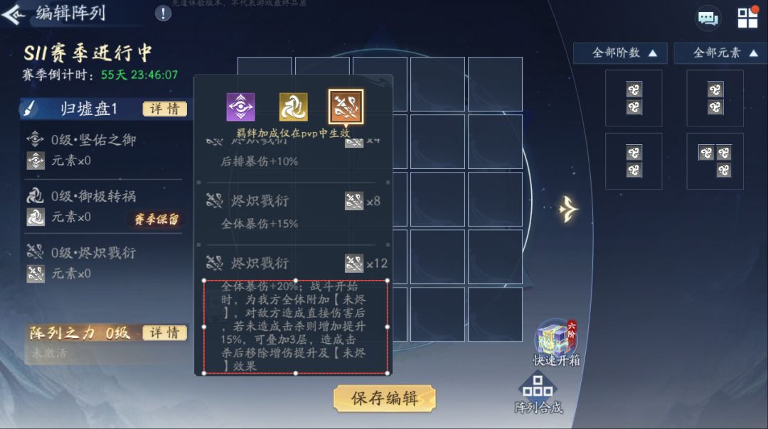 本赛季S11归墟盘的三种元素为:坚佑之御(全体血量)、御极转祸(全体防御/上赛季保留)、烬炽戮衍(全体暴伤)