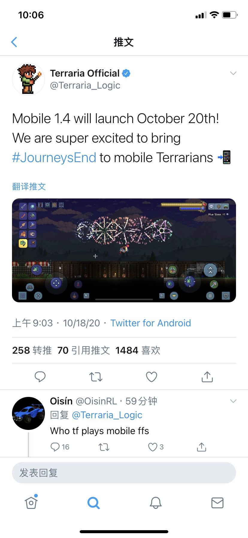 官方推特刚刚更新:国际服1.4即将于10月20日登录手机版!能够把最终的旅途带到手机版,我们真的炒鸡炒鸡兴奋!
