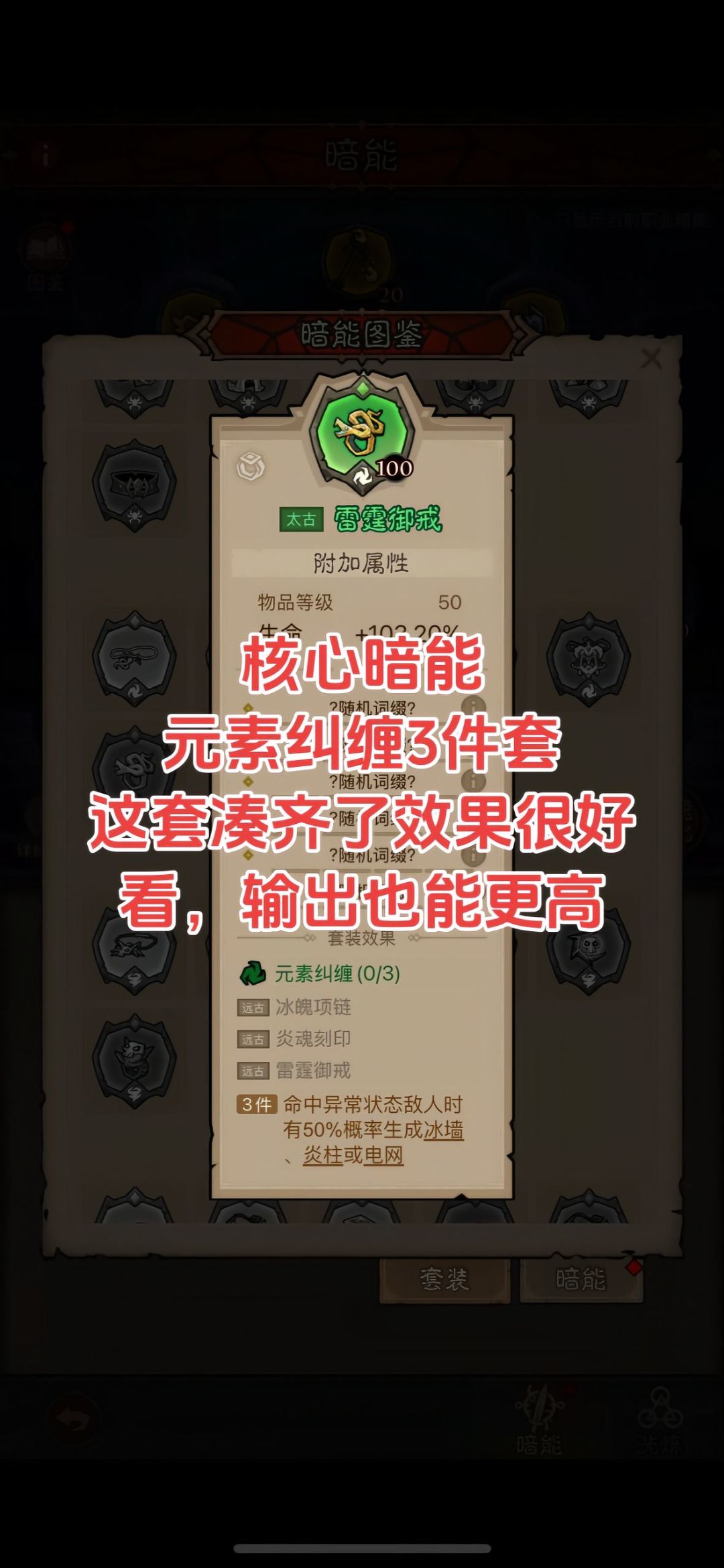 这套效果不炸裂,但是很稳定,所有类型boss都能打,适合脸黑凑不齐一套的哥们,三种元素配合,能控场能输出能爆发,而且火眼的地火配合分身冰法的冰环,再加上掌控的领域,契合度很高,强度我个人觉得同水平高于任何一个单一流派
