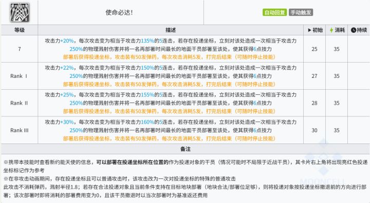 II.尽管该技能冷却为35s但因为召唤物本身再部署冷却为70s,受银灰减再部署,故只能70s投递一次