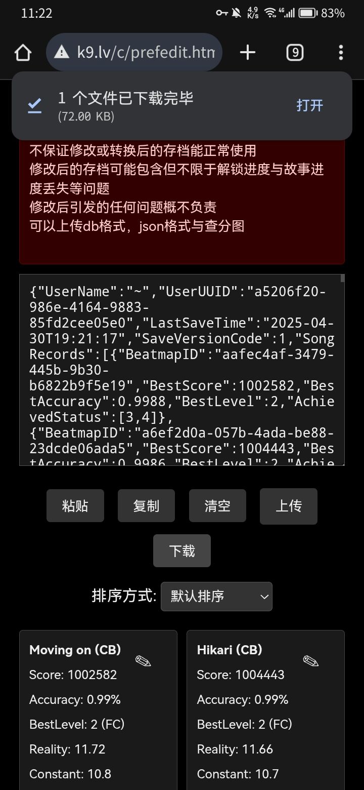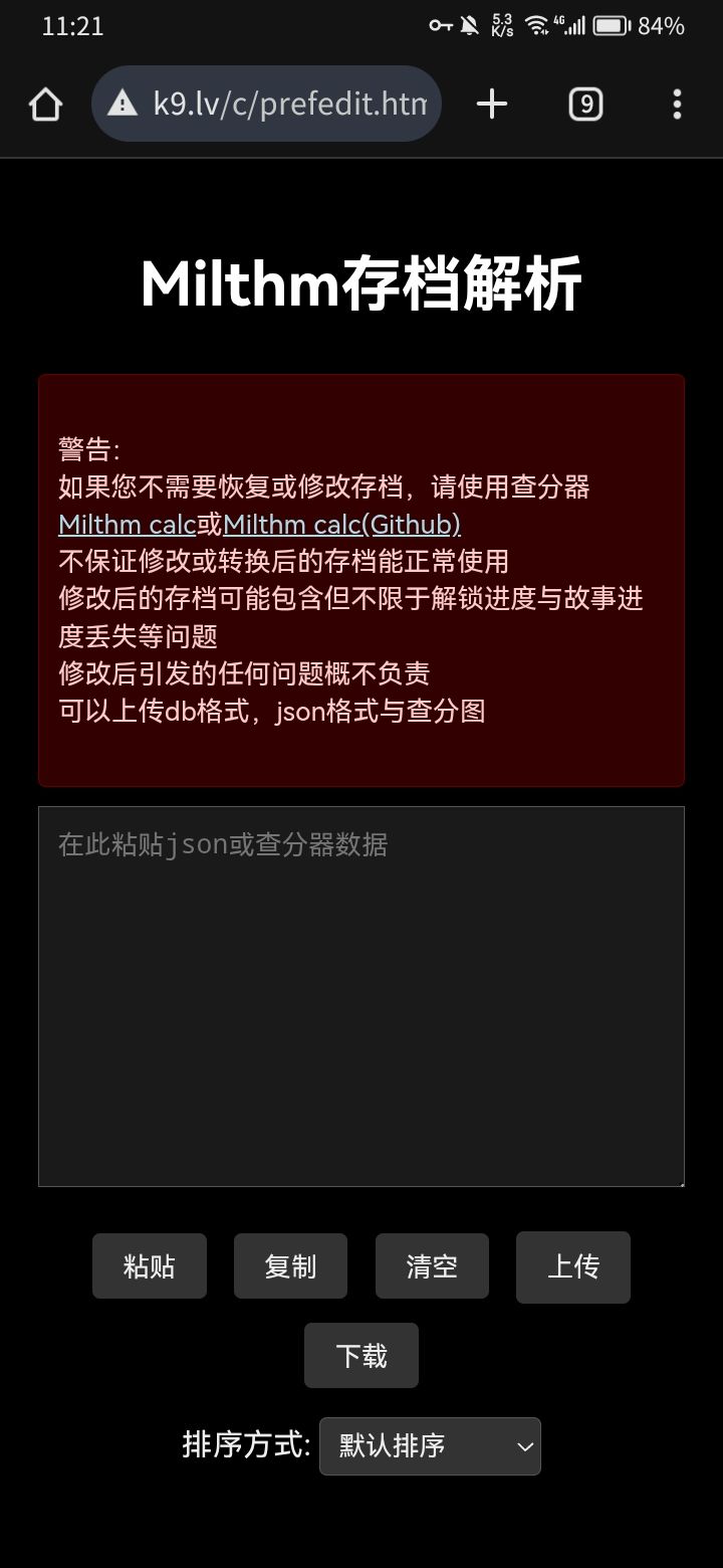 r如果你在查分后因为各种原因不小心把存档搞没了,可以在查分网站(如图)的后面加个prefedit.html进入存档编辑器,点击 上传文件 选中你曾经的查分图并上传,随后点击下载得到saves.db,粘贴回原位