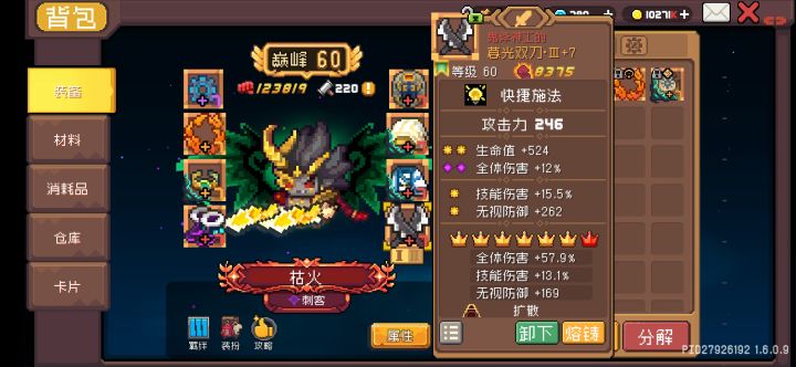 装备方面:刺客的红武不过路边一条,凭潜行姿态的CD根本碰瓷不了消耗战意重置,暮光双刀更为适配。卡包券多或者肯刷的,武圣凯头甲加项链是最棒的选择(潜能共振必要怒环),高额增伤谁用谁知道。用散件的话就羽衣无瑕怒环,共振挂魔术大师(主要是共振不能上升灵之戒不然戒指位换一下更好)。戒指推荐本赛季新出的升灵戒,补伤害上佳之选,只考虑刷图它是最优的。如果打高难,戒指要换低语或黑气宗,挂流血的同时挂易伤。鞋子用吞灵履,增伤加速都有的超雄鞋子;或者穿失落将军鞋,对于刺客这种弱对单职业是有效的补短措施。副手无所谓,常规大宗师增伤(tips:新版本可以合成低于自己当前等级的装备,不用傻乎乎的去刷枫林,秘境出的卡还不够你合把55级的大宗师?)