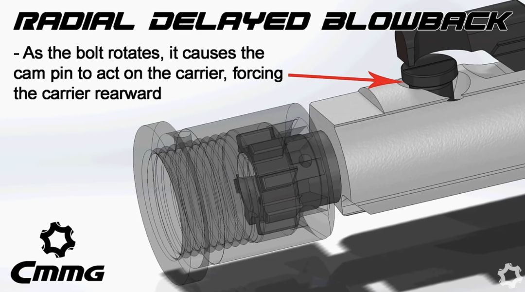 由于.45 ACP的弹药比起一般的9x19mm子弹来说后坐力要大上不少,为了能够更好地发射.45 ACP弹药,CMMG公司开发了一套名为径向延迟反冲系统(Radial Delayed Blowback Operating System)的枪机系统。传统直吹式PCC在使用高装药量弹药时易出现“过早开锁”,导致抛壳故障。径向延迟系统通过特殊设计的枪机来强制延迟后坐力反冲,确保弹壳在安全膛压下抛出。既增加了武器的可靠性,降低了武器的可感后坐力,还减少了枪机的重量,一举三得。