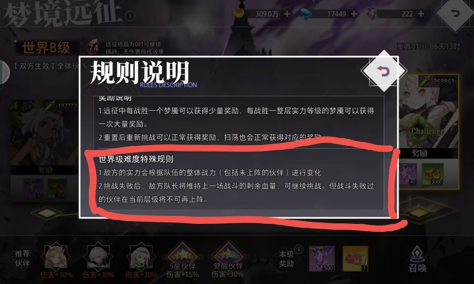 想要更容易通关梦境远征,要利用游戏里世界级难度特殊规则,敌方的实力会根据队伍的整体战力进行变化,包括不上阵在仓库里的角色!!!因此,在打完前面四关情况下,第五关你需要下装备进而令你整体战力下降,使下个世界难度关卡战力不会提升那么高导致战力差距过大。