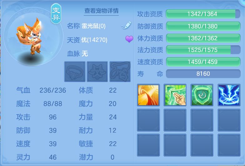 重点推荐雷光鼠,作为前期最强的单法宠,凭借特殊技能与法连配合使用,能打出不俗的伤害,如果想在65以后打pvp,必须拥有一个高品质的雷光鼠,同时也具备不错pve能力(如果只追求pve并且只打算过渡使用的话简单洗练一下即可)。高品质雷光鼠必须是5技能,法资高,橙心以上,打书推荐,特殊技能、高级法爆、高级法连、高级光芒、高级灵蕴、高保命/神佑,小克制/小防御;过渡使用的话则要求较低(下面放一个过渡的例子,这种就是带上护符直接使用,剩一笔打书的银子)