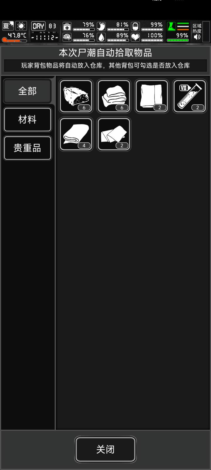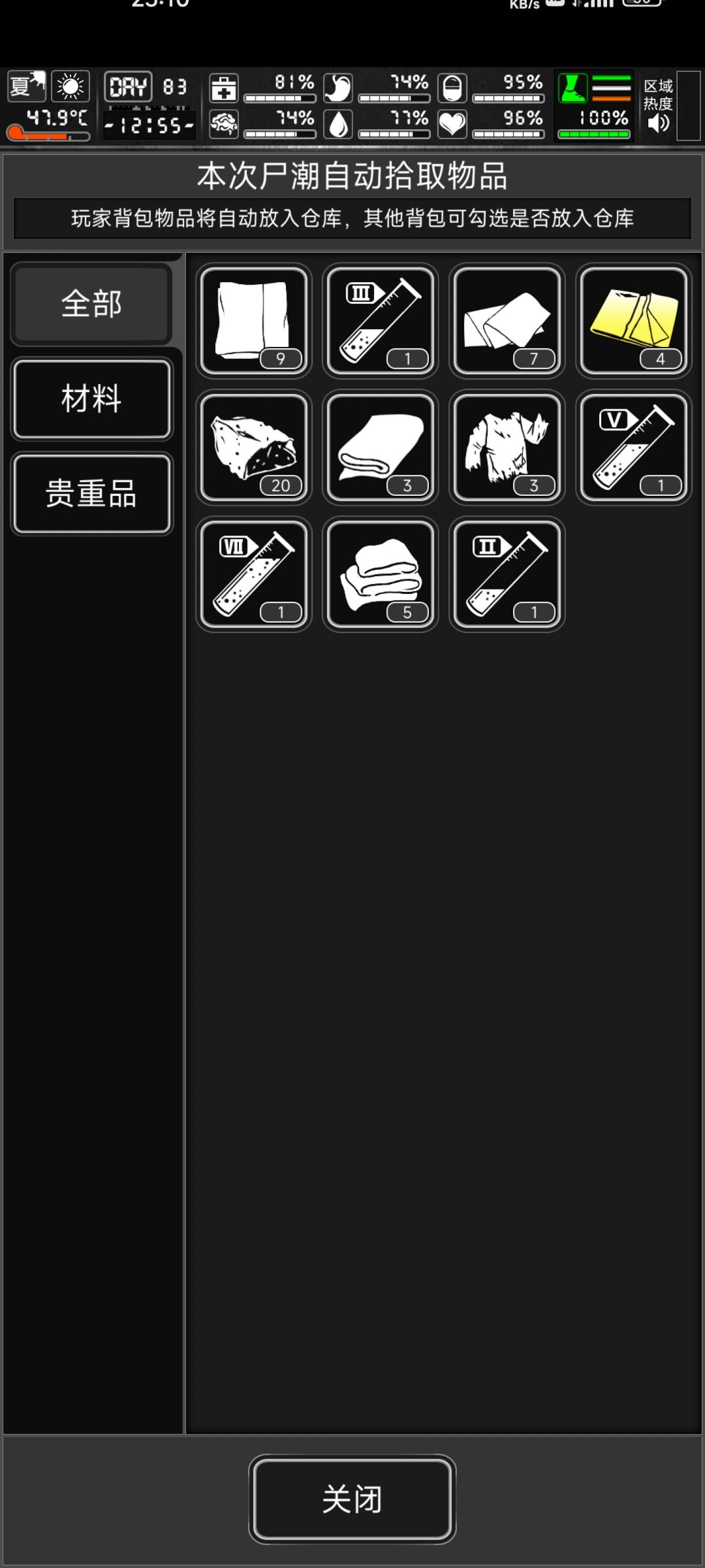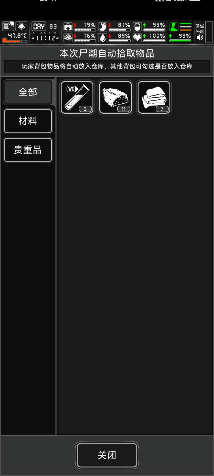 ★★★尸潮(这个试验很多次)【正常捡或出口撤出】与【存档后大退】见图2.3。结果不一样★☞结算的【布料!肯定!会变高级】,如棉帆尼龙布黄布等(适合萌新化学台卡布料的情况)★【血的种类和数量也会有变化】!!(萌新注意打了7阶没血的话可sl)【血数量种类也会有变化!!】★首次sl变化最大!!后续多次sl的种类数量变化很小,如上图。布制品和铁制品(高密板,黄碳板,铁管,弹簧,黄绝缘零件,黄电子零件,聚合纤维都爆出过)会有种类和数量变化。