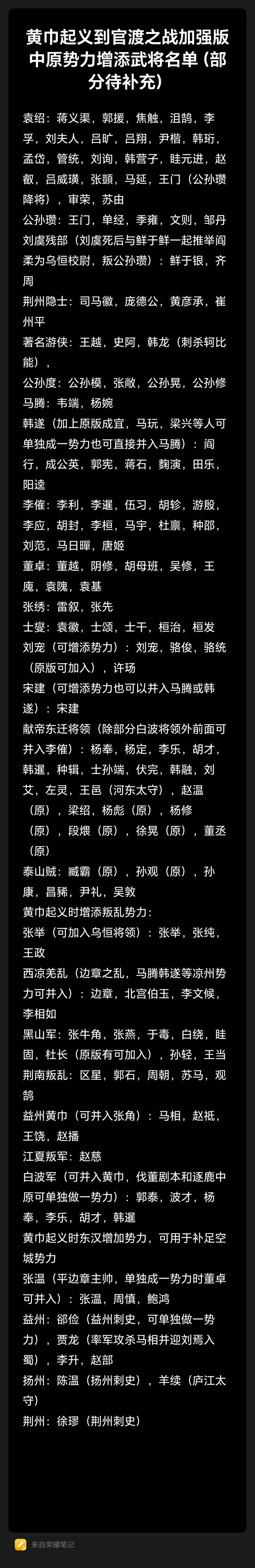 自已整理了一份可增加武将名单,方便大家补充三国自建,都是逐鹿官方没做的将,逐鹿有的后面有标注原版,有需要的可以参考下,传记可以在浏览器上直接复制。