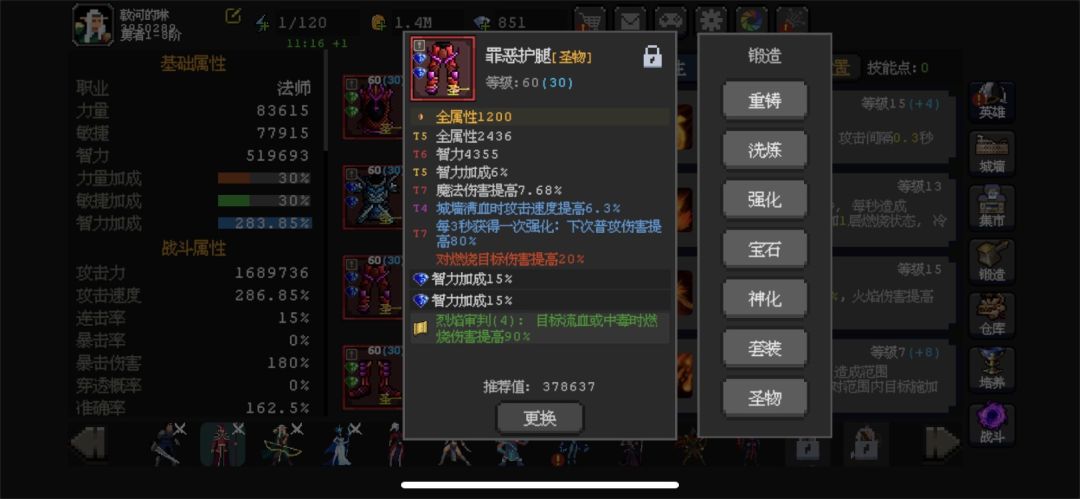 罪恶护腿(魔龙护腿) 对燃烧+20%和蓝宝石(圣物全属性1200)