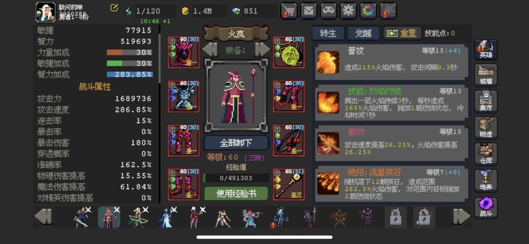 以下图片是他五一期间刚三转的火法面板。他上次活动运气好拿了连击神器!可以给辅助省了一点宝石。对整个攻略影响不大!!!